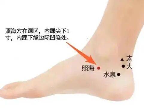 【功效】:主治咽喉干痛、月经不调、失眠等。照,照射也。海,大水也。肾经经水在此大量蒸发,可吸热生气。