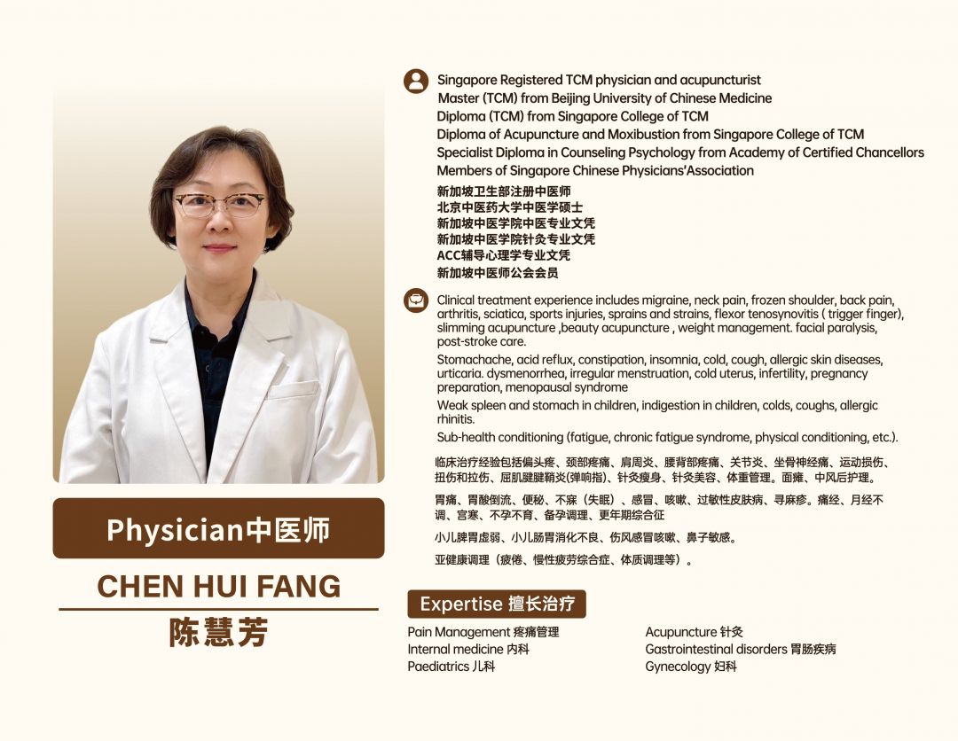 陈慧芳医师 CHEN HUIFANG,新加坡注册中医师。进修期间跟随名老中医学习,针灸基础理论扎实,积累了较为丰富的临床经验。
