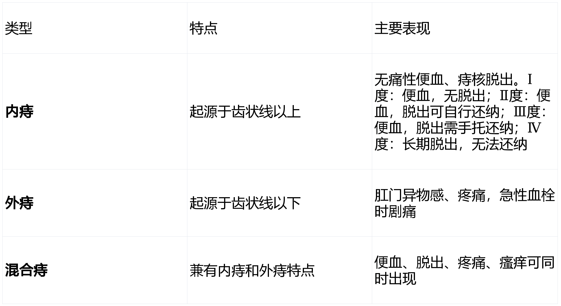 痔疮主要分为内痔、外痔、混合痔三种: