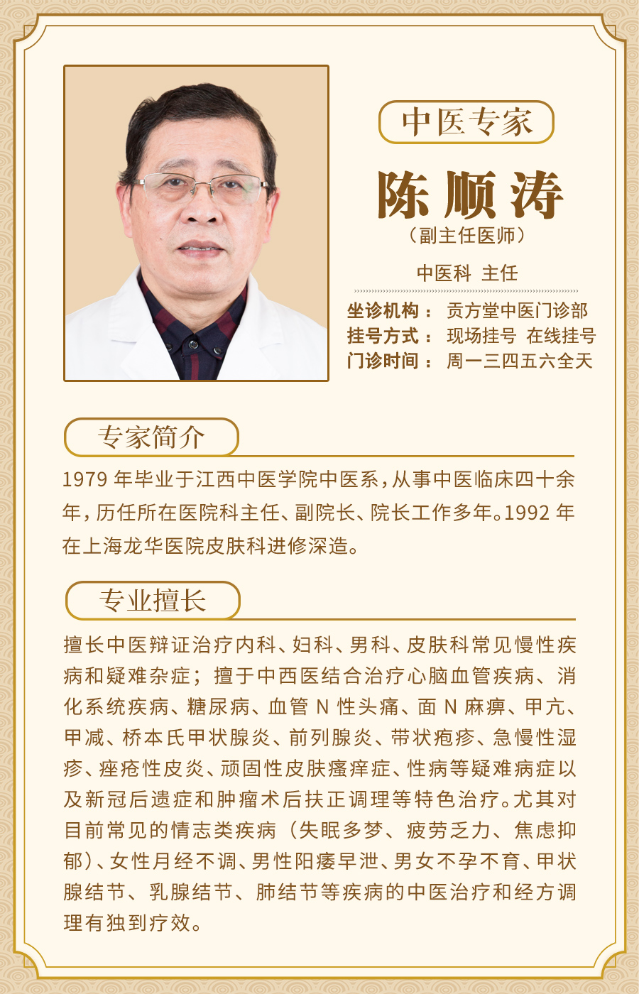 陈顺涛,贡方堂国医馆中医科副主任医师,1979年毕业于江西中医学院中医系,从事中医临床四十余年,历任所在医院科主任、副院长、院长工作多年。1992 年在上海龙华医院皮肤科进修深造。