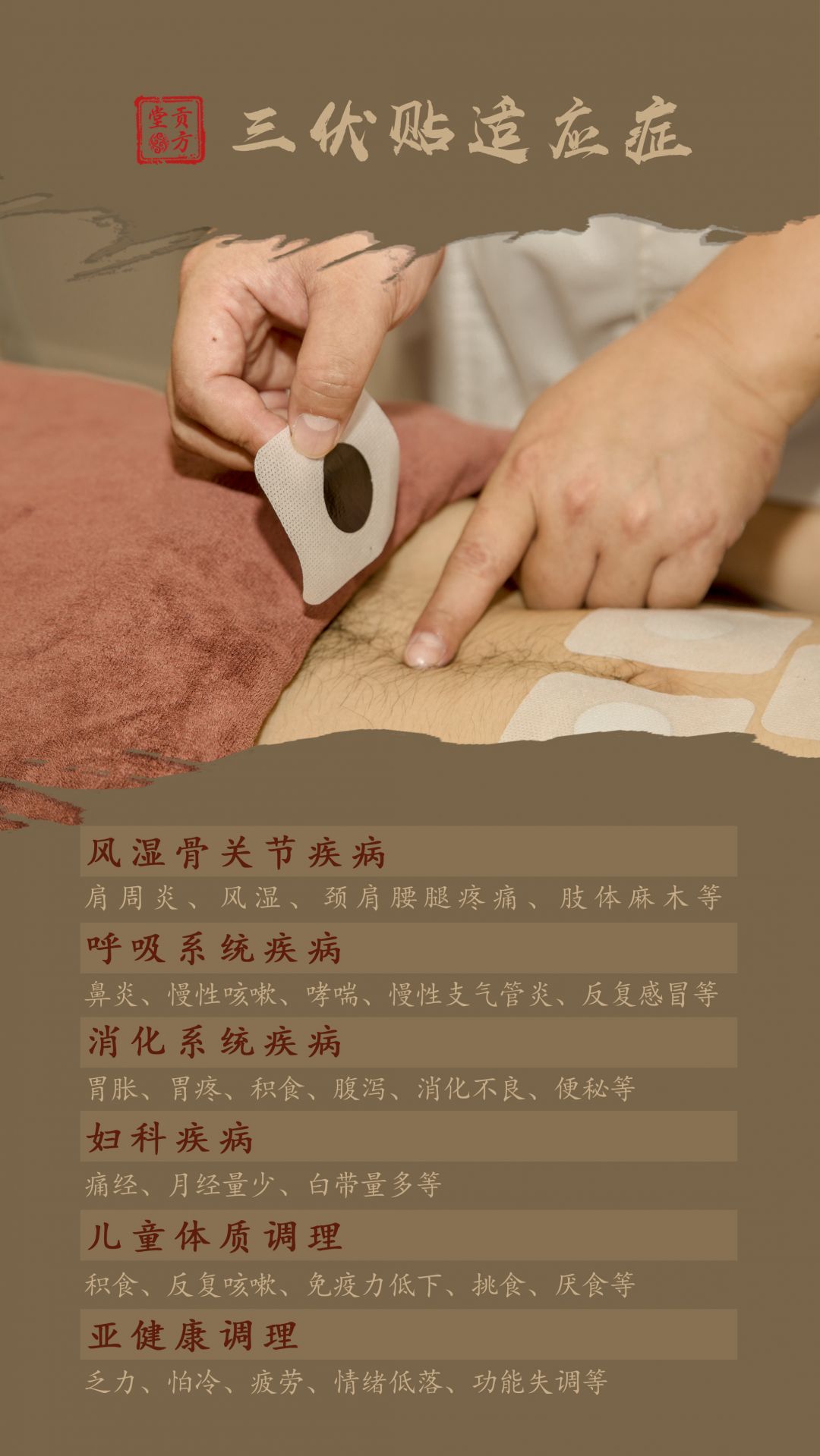有了“三伏贴”,“三伏”暑热湿气重,轻松搞定!冬病夏治“三伏贴”,可使补阳祛邪之力,用于各种慢性病、关节不适、妇科疾病等。